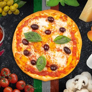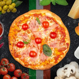 sos pomodoro, mozzarella, prosciutto cotto, rosii cherry, busuioc fresh (510 gr.)